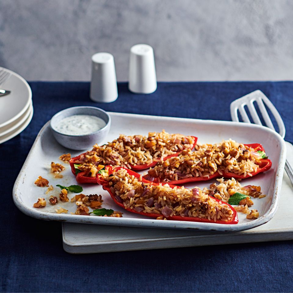 California walnuts taste great and research suggests that the nutrients and minerals found in walnuts could help to support heart, brain and gut health. Enjoy them on their own, or as a ingredient in dishes such as these baked peppers stuffed with fragrant California walnut and apricot pilaf served with herby yogurt.
