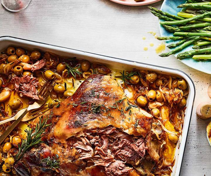 Get the lamb shoulder, caramelised onions and olives with buttered asparagus recipe