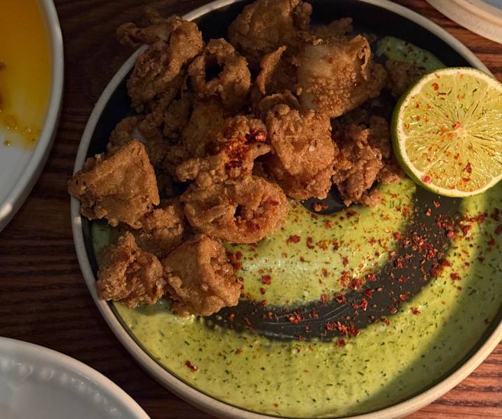 Next, we moved on to mezze, with staff recommending two to three plates per person – although I will say, this felt like a lot. We opted for the charred celeriac with aioli and confit garlic, smoked Greek feta sausage, roasted chicken with sundried tomato harissa and labneh, the calamari with zhoug aioli, and a Greek salad (for balance).