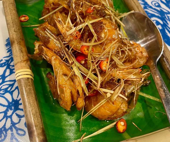 Next came a bamboo platter piled high with crispy shell-on prawns – our lovely server Michelle insisted we could eat these whole, and she was right. The flavours of chilli and shredded lemongrass came through perfectly and they were the ideal finger food.