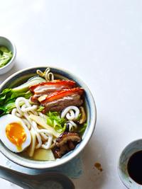 4. Ladle in the hot broth. Add the pak choi, slices of roast pork belly or pork streaky rashers and two softly boiled eggs, halved.