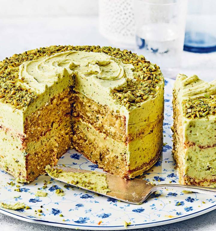 - To serve, level the tops of the cake if necessary, and place one cake on a serving plate or cake stand. Spread the top with pistachio frosting and then swirl through the lemon curd. Top with the second cake and then finish with another layer of frosting, spreading some around the sides of the cake too, if you like. Roughly chop the remaining pistachios and scatter around the rim of the cake to serve.