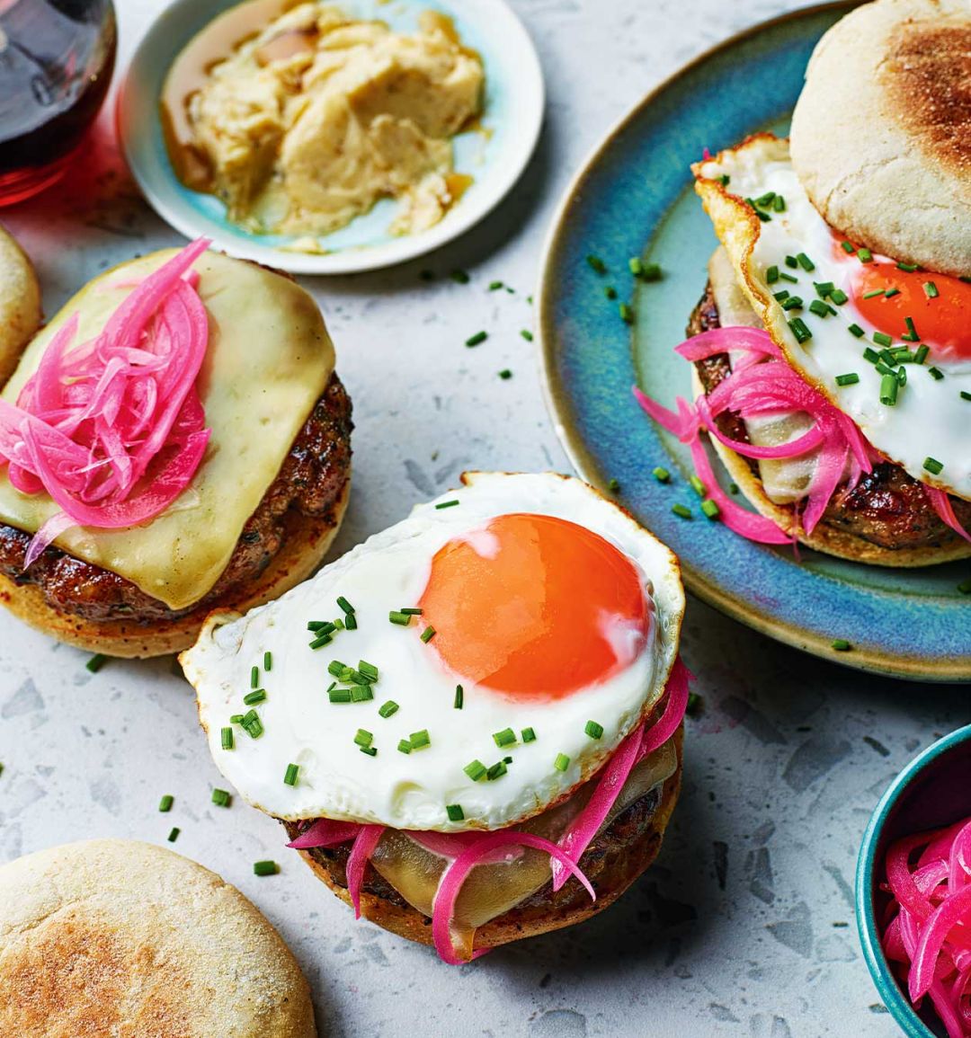 In the same pan, carefully remove any burnt bits of cheese, then turn the heat back up to medium-high. Crack in the eggs and season. Cook until the whites have set, the edges are crispy and the yolks are still soft (about 2-3 minutes). Meanwhile, cut the muffins horizontally in half and toast. Mix the softened butter with 1 tablespoon of maple syrup and a little black pepper, then spread onto all cut sides of the toasted muffins. Top 4 buttered muffin halves with the cheesy sausage patties. Finish with the pickled onions, fried eggs, remaining chives and the muffin tops.