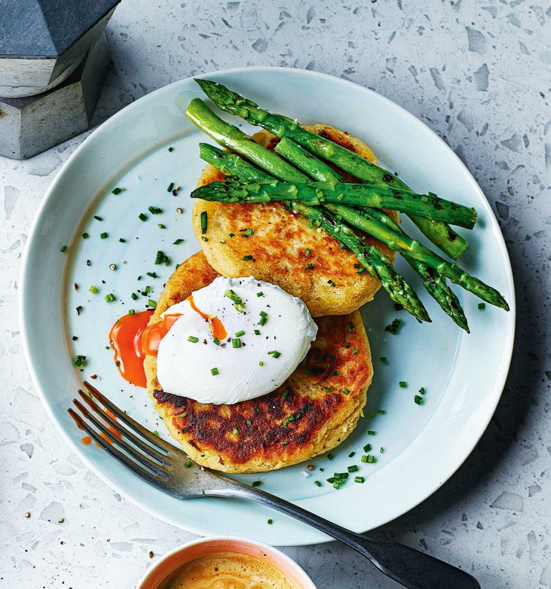 Put the mashed potato and flour in a large bowl and crack in one of the eggs. Season generously, then mix well with a wooden spoon until smooth. Shape into 4 pancakes, each about 10cm in diameter.
