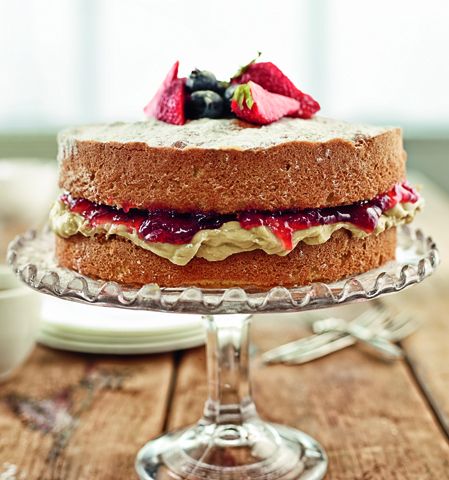- Sandwich the two cakes with the jam and cream. Sift a generous dusting of Golden Icing Sugar over the top and decorate with the fruit if using to serve.