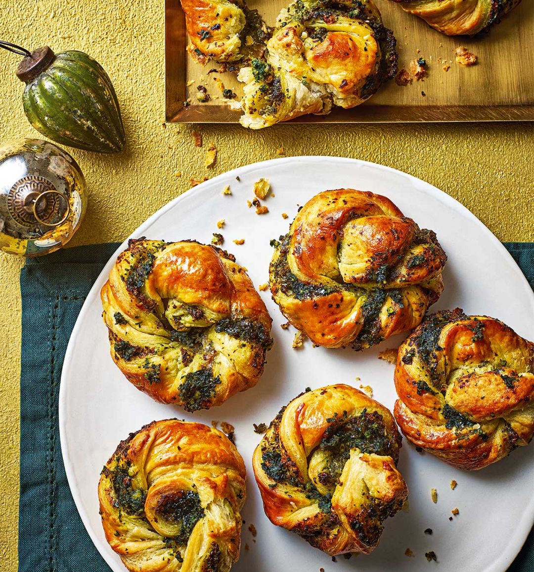 These golden puff-pastry swirls are filled with a pesto-inspired blend of spinach, basil, chestnuts and cheese. They make a great party nibble or a savoury side to soup. Prepare the swirls up to a day ahead and simply bake to serve