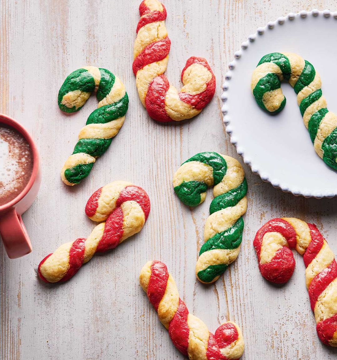 Quickly roll each piece into a 17cm rope. Lay a plain piece of rope and a coloured piece of rope next to each other and gently roll the two together, twisting into one rope. Transfer to a baking tray and curve the top of the dough into a candy cane shape. Repeat with all the dough, spacing them apart on the trays. The dough will soften the longer you work with it so pop it back into the fridge for no more than 5 minutes if needed.
