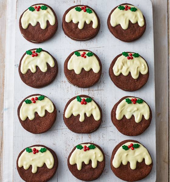 - Once cooled, transfer the ganache to a piping bag fitted with a small round piping tip and use to sandwich the cookies together. To decorate the cookies, put the 200g chocolate in a heatproof bowl and set over a pan of simmering water, stirring occasionally until fully melted. Remove the bowl and set aside to cool for 15 minutes, then pour into a piping bag fitted with a thin round piping nozzle. Pipe the outline of a Christmas pudding on top of each cookie. Once the outlines have been piped, use the remaining chocolate to roughly fill in the decoration. Use a toothpick to tease the chocolate so that it spreads out and fills the outline. Decorate the cookies with the holly and ivy sprinkles and leave for 20 minutes to set.