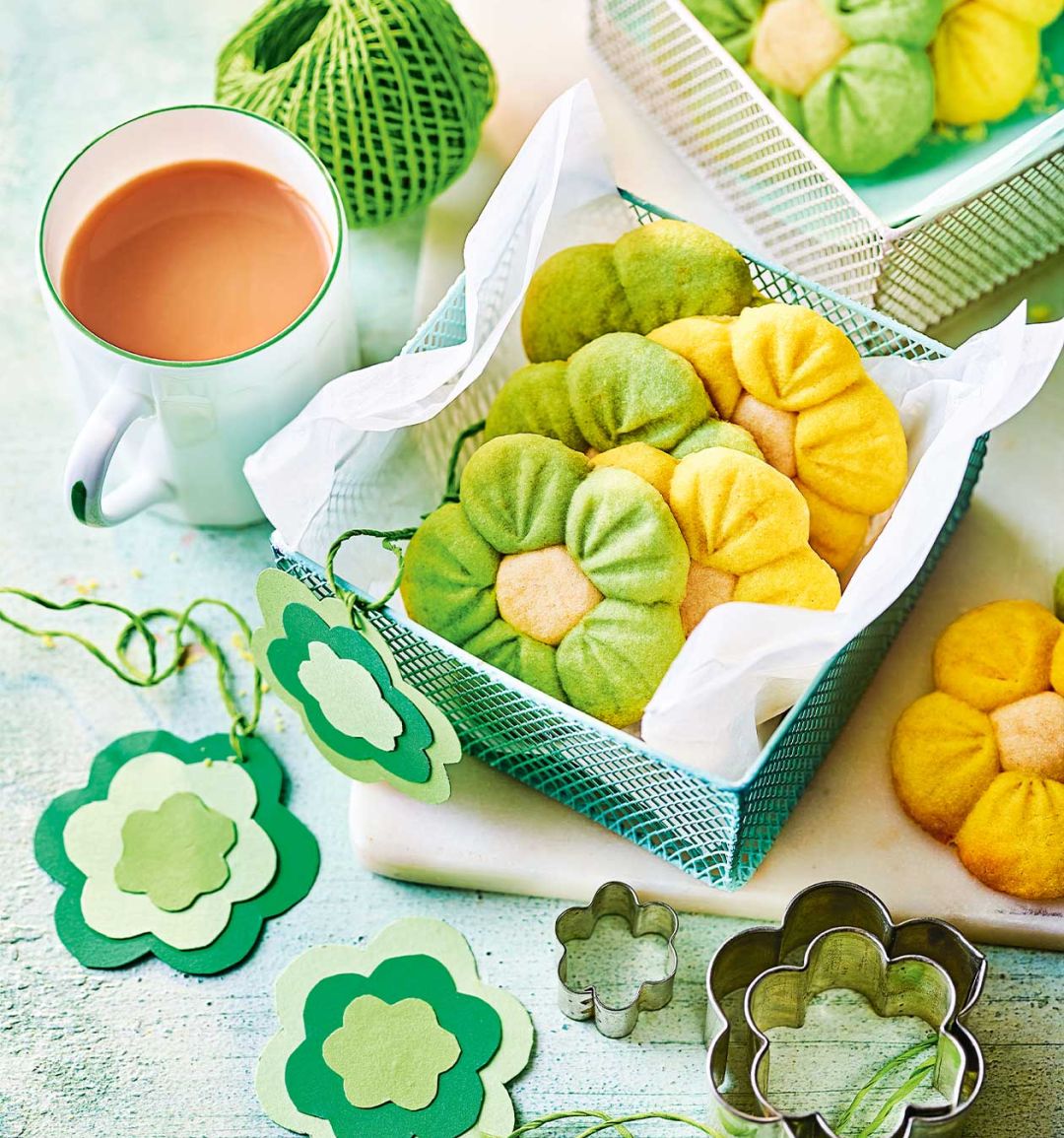 Divide the uncoloured dough into 10 teaspoon-sized portions and roll into smooth balls. On the lined baking tray, place one ball of uncoloured dough on the tray and surround it with five coloured dough balls for the flower petals, gently squishing them together so they’re all touching. Repeat with all the dough balls, leaving around 5cm between each cookie. Use a glass or ramekin to gently press down on each cookie, with a small piece of baking paper between the dough and ramekin or glass to prevent sticking. Use a toothpick to mark thin lines on each ‘petal’. Transfer the baking tray to the freezer and chill for 15 minutes.