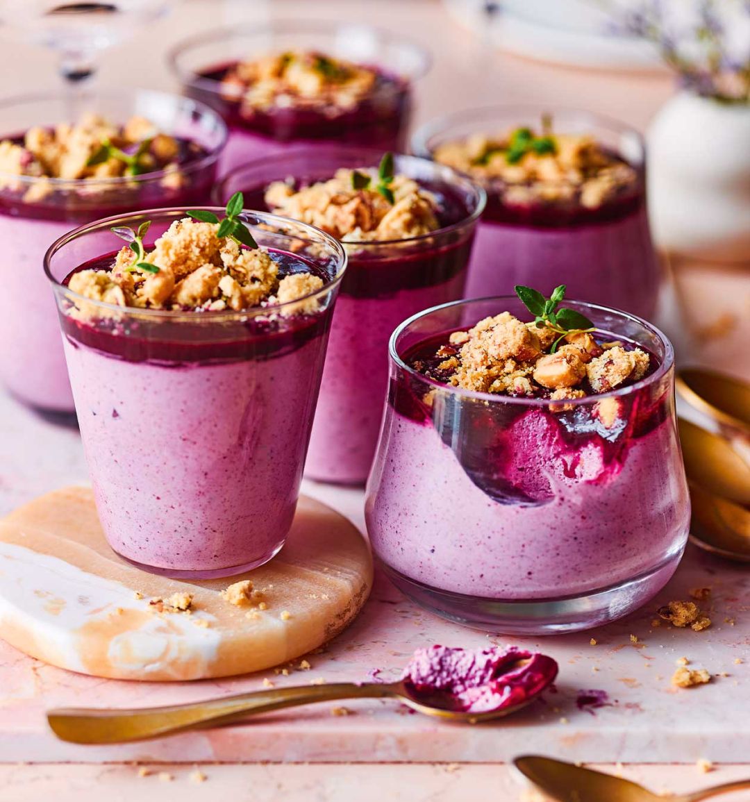 Bursting with blueberry flavour, these individual mousses make an ideal get-ahead dessert for entertaining. Blanched almonds or pistachios work just as well in the crumble topping, if you prefer