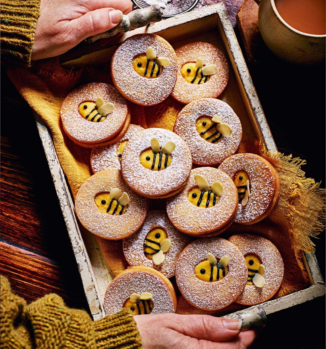 Spreadable set honey steps in for most of the sugar in these buttery shortbread biscuits. They’re sandwiched with a zingy white chocolate and lemon ganache, then decorated with bee stripes and little almond ‘wings’