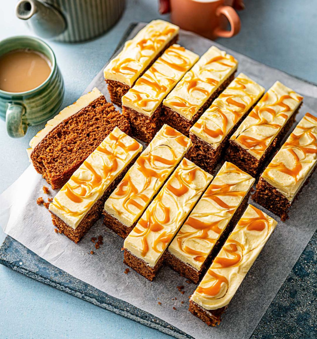 Remove the cake from its tin onto a serving board. Spoon on the cream cheese frosting, swirling it to the edges of the cake. Add small spoonfuls of the salted caramel, if using, and drag through a cocktail stick or the tip of a knife to swirl it into the cream cheese. Cut the cake in half, then cut each half into 6 rectangular fingers to serve. Store for up to 5 days in an airtight container.