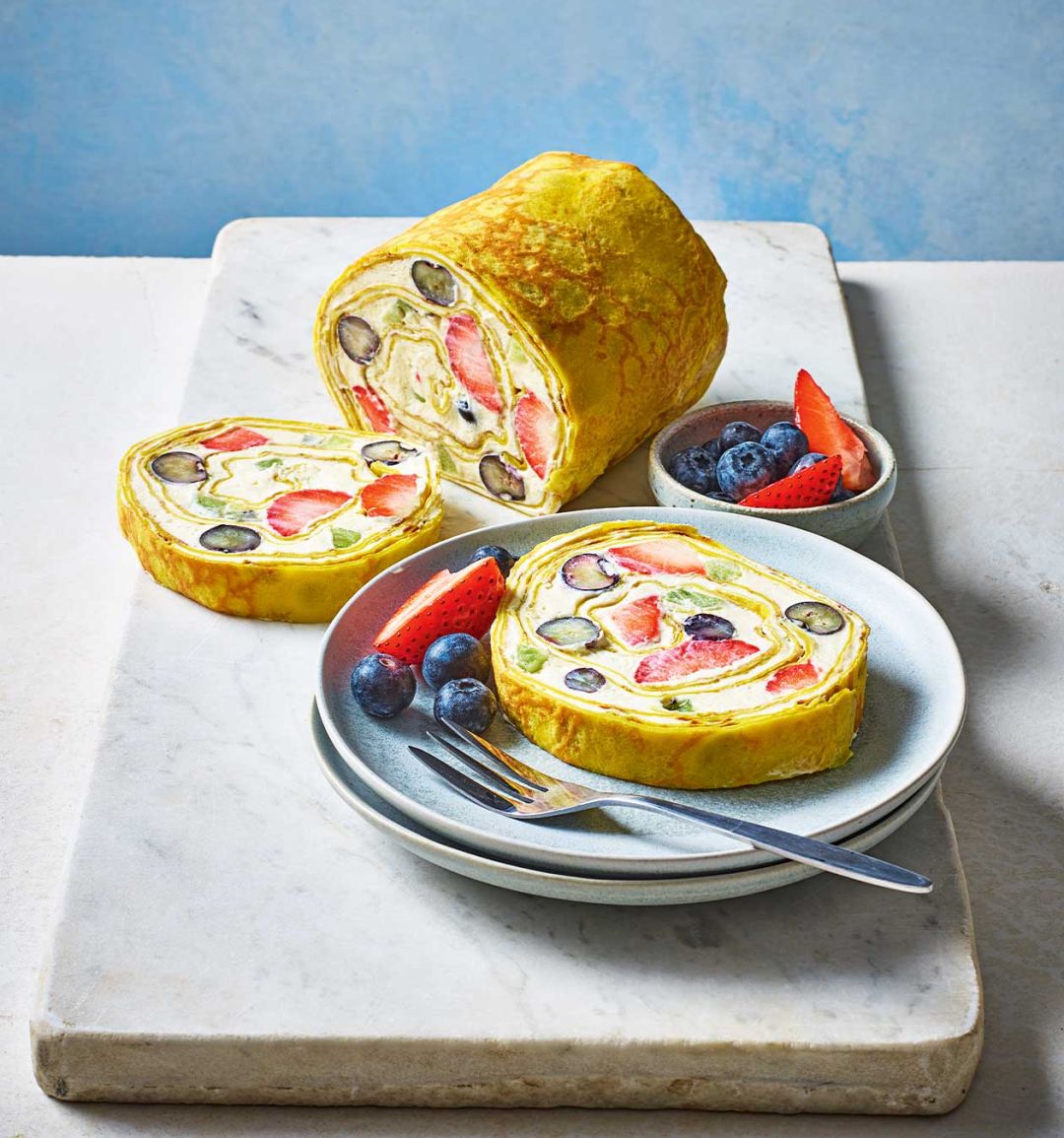 To assemble the roll, place a large sheet of baking paper on a board and arrange 4 crêpes in a line, overlapping slightly, with the shortest side facing you. Spread the crêpes with one-third of the cream filling, leaving a 3-4cm border all around. Top with another layer of 4 crêpes and another third of the cream filling. From left to right, arrange the fruit in short lines across 3 of the crêpes, leaving a 1cm gap between each line and leaving the fourth crêpe free. Spoon the remaining cream into a piping bag fitted with a wide, plain nozzle and pipe the cream between the rows of fruit. Use a palette knife to smooth over the filling.