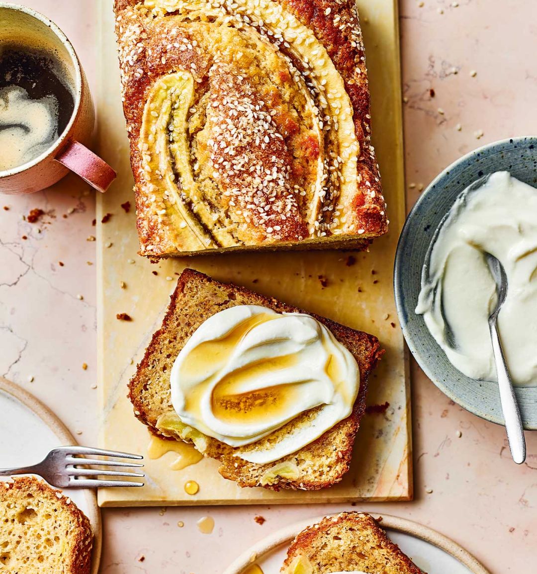 Put the cottage cheese in a small food processor or blender, then whizz until smooth and creamy. Transfer 100g to a mixing bowl (set the rest aside in the fridge) and add the oil, eggs, miso and brown sugar. Beat with an electric hand mixer for 1-2 minutes until smooth and combined. Add the mashed bananas and beat again briefly (some small lumps are fine). Sift over the flour and baking powder, then fold in with a large metal spoon until no pockets of flour remain. Spoon into the prepared loaf tin and level the surface. Peel the extra banana and carefully slice it in half lengthways then rest it on top of the cake batter, cut sides up. Combine the sesame seeds and demerara sugar in a small bowl, then sprinkle this all over the top of the loaf.