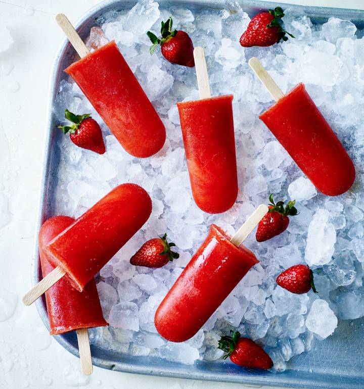 Summer-ripe strawberries accentuate the fruitiness of the rosé wine in these grown-up ice lollies. You will need lolly moulds and sticks.