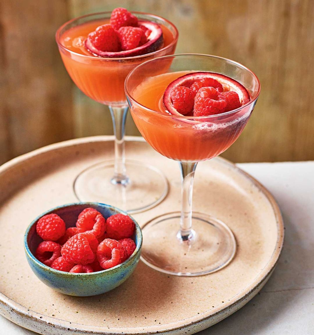 Strain into martini glasses and top up with rosé prosecco. Garnish with the hollowed-out passion fruit halves filled with raspberries and serve.