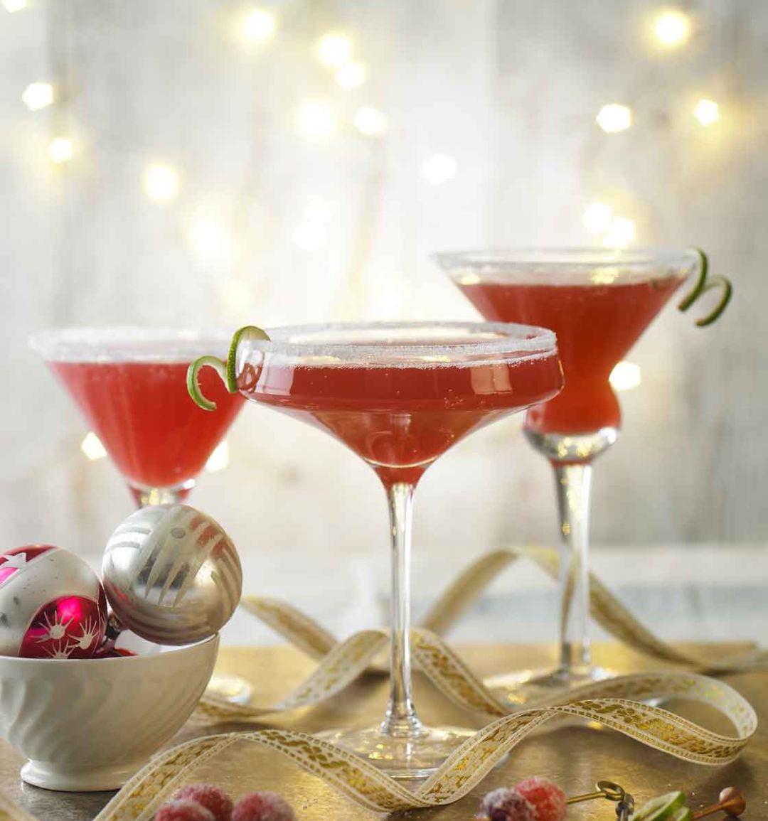 - Divide the chilled liquid between 6 glasses (first, dip the rims in lemon juice, then caster sugar). Add 1 teaspoon vermouth and 2 tablespoons vodka (or gin) to each. Top with chilled soda water. Decorate with frosted cranberries and lime zest twists.