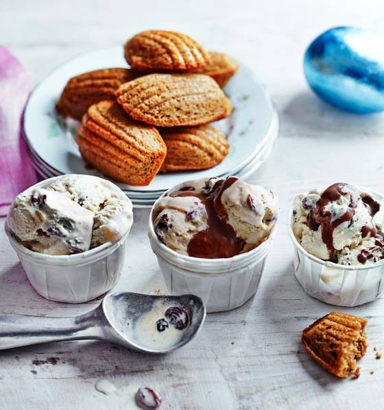 - Serve the ice cream with the chocolate sauce and warm cinnamon madeleines.