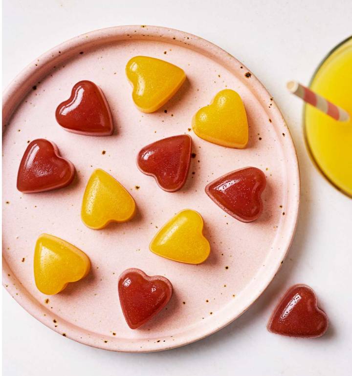 - Sprinkle the gelatine over the warm fruit mixture and whisk until dissolved. Transfer the mixture to a piping bag and pipe into the moulds, or pour straight into the lined tin. Transfer to the fridge for 30 minutes or until completely firm. Pop the jellies out of the mould onto a wire rack, or turn them out from the tin and cut into desired shapes. Leave to sit for at least 3 hours. This stage is important, as it allows the gelatine to set further and create a bouncy chew.