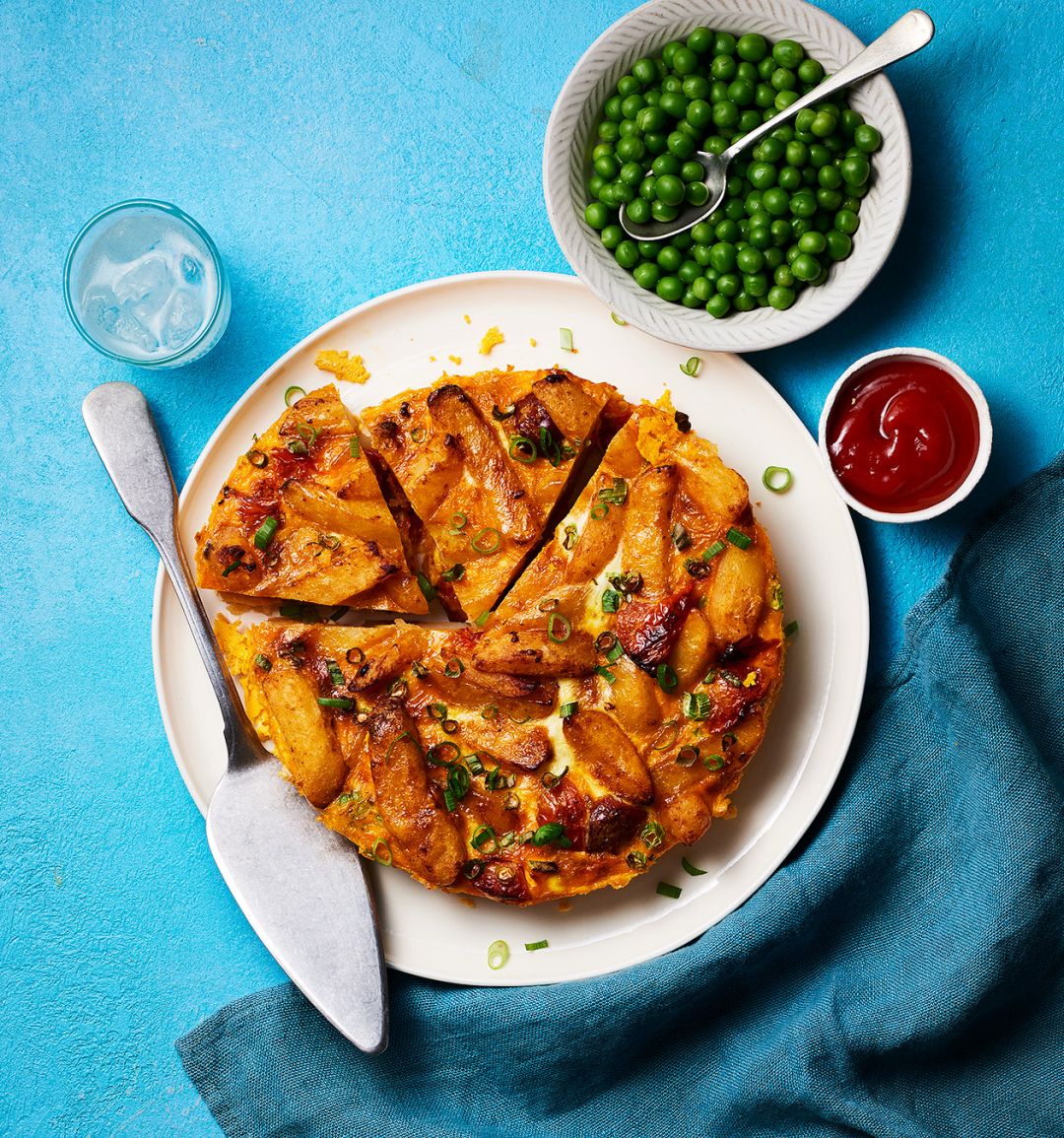 - Leave to rest for about 10 minutes before serving, scattered with the rest of the spring onions. Cut into wedges and serve with peas, ketchup or barbecue sauce and bread and butter.