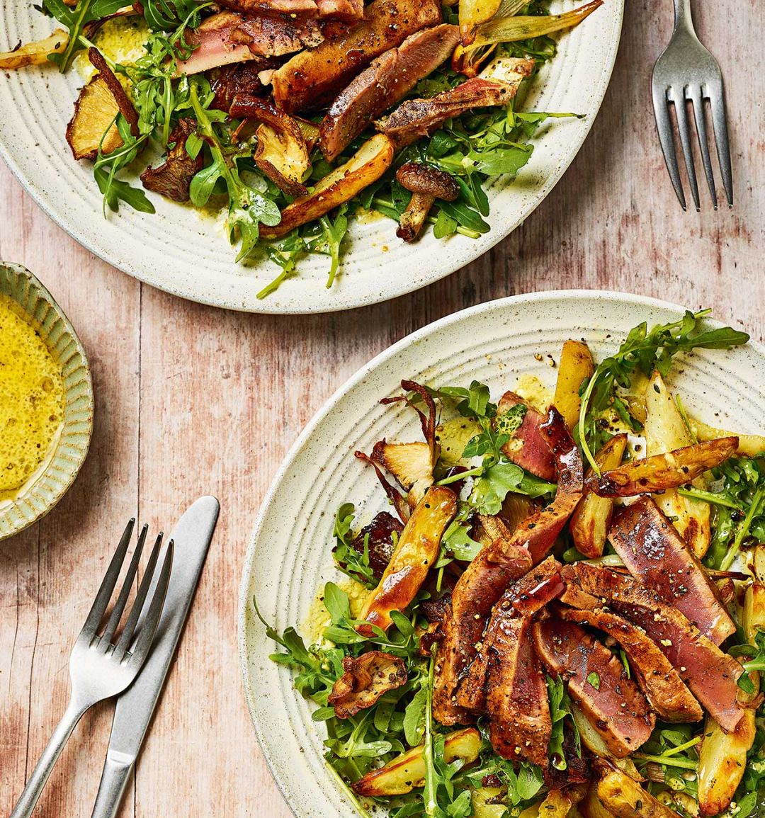Balsamic tuna steaks with warm roast potato and mushroom salad
