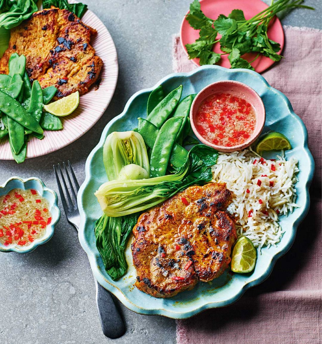 Remove the pork steaks from the pan and cover them with foil, allowing them to rest for a few minutes. Heat the rice according to pack instructions. Transfer the steaks to four serving plates, drizzle the dressing all over and serve with the rice, plus lime wedges, steamed greens and some coriander, if liked.