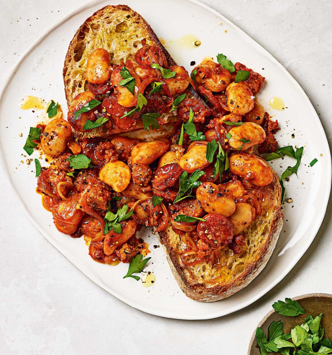 Meanwhile, toast the bread. Top the toast with the fabada and a grind of black pepper. Scatter over the parsley and serve immediately.