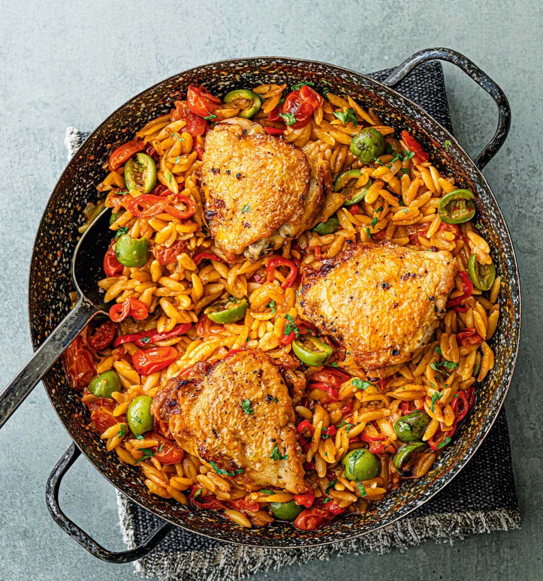 Add the tomatoes, olives and balsamic vinegar. Stir to combine, then pour in 100ml water and season. Nestle the chicken on top, skin-side up, then transfer to the oven for 15 minutes. Remove from the oven, take the chicken out, then stir in the orzo and chicken stock. Place the chicken back on top, then return to the oven for a further 20-25 minutes or until all the liquid has been absorbed and the orzo is cooked through.