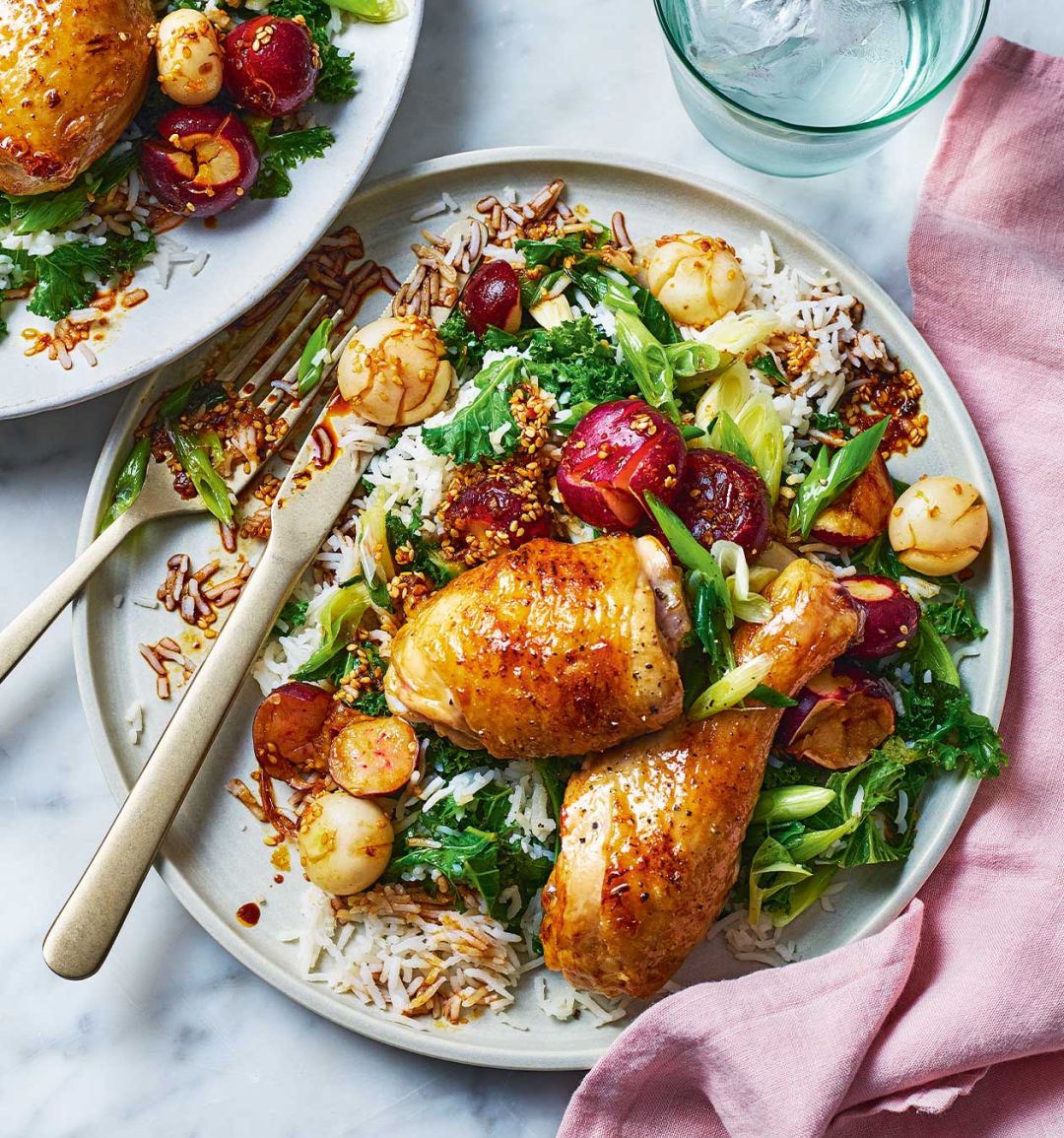 Return the pan to a medium-high heat and add the spring onions and kale stems with a pinch of salt. Stir-fry for 2-3 minutes to soften, then add the kale leaves and cook for another minute. Add a splash of water to help steam the kale and cook for another minute until wilted. Stir through the drained cooked rice and the remaining tamari until combined. Serve the kale rice topped with the chicken, smacked radishes and any marinade left in the bowl.