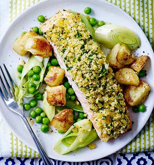 Citrus-crusted salmon with buttered leeks and roasted new potatoes