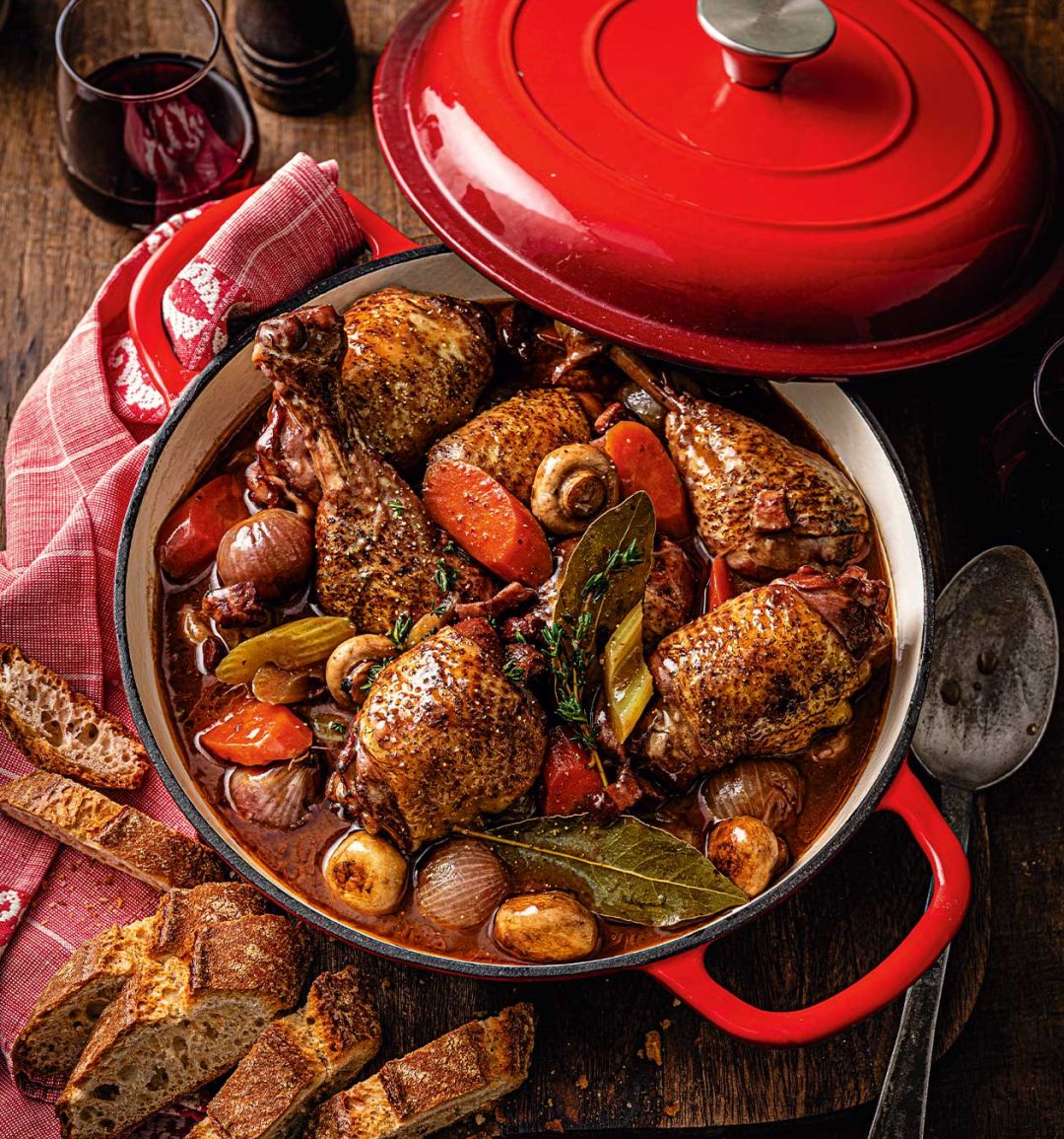 A bold braise with chicken, red wine, bacon and a kick of brandy, this slow-cooked traditional French dish is the ultimate in comfort food