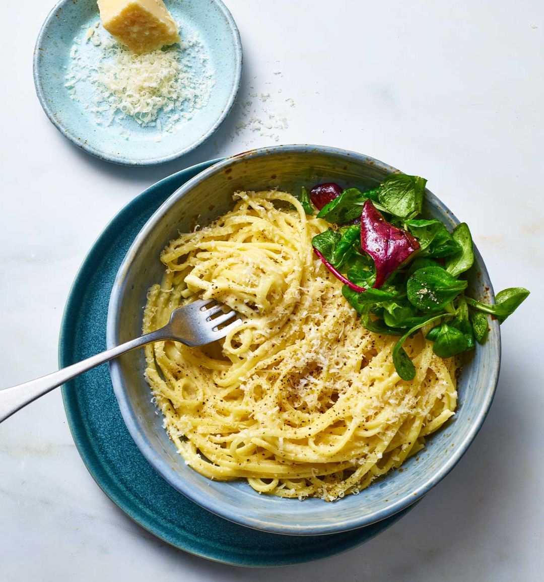 Add the pasta to the pan with the sauce and toss to coat. Add a little of the pasta water to loosen the sauce if needed. Season with freshly ground black pepper, sprinkle with extra parmigiano reggiano and serve with salad leaves on the side.