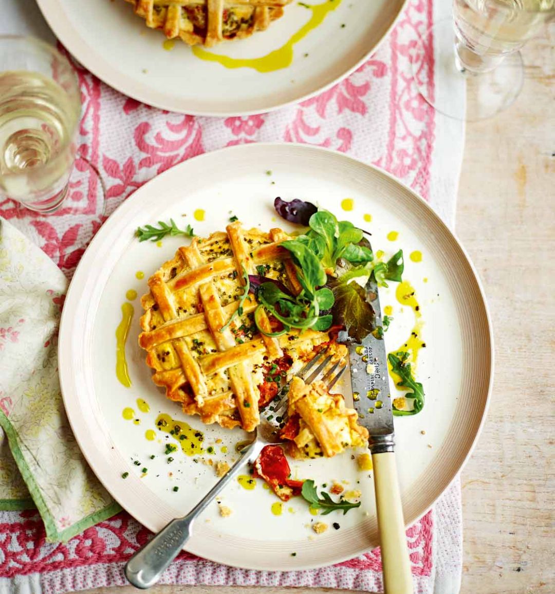 If you’re making individual pies, you’ll need 6 tart tins measuring 8cm x 2.5cm deep. But if you prefer to make 1 large pie (serves 8), use a 23cm loose-bottomed fluted tart tin, 3cm deep. Increase the filling – use 250ml crème fraîche, 2 large eggs, 25g Parmesan, ¼ teaspoon cayenne pepper and 200g crab meat (use the same amount of chives and tomatoes). Use longer strips of pastry for the lattice and bake for 40 minutes.