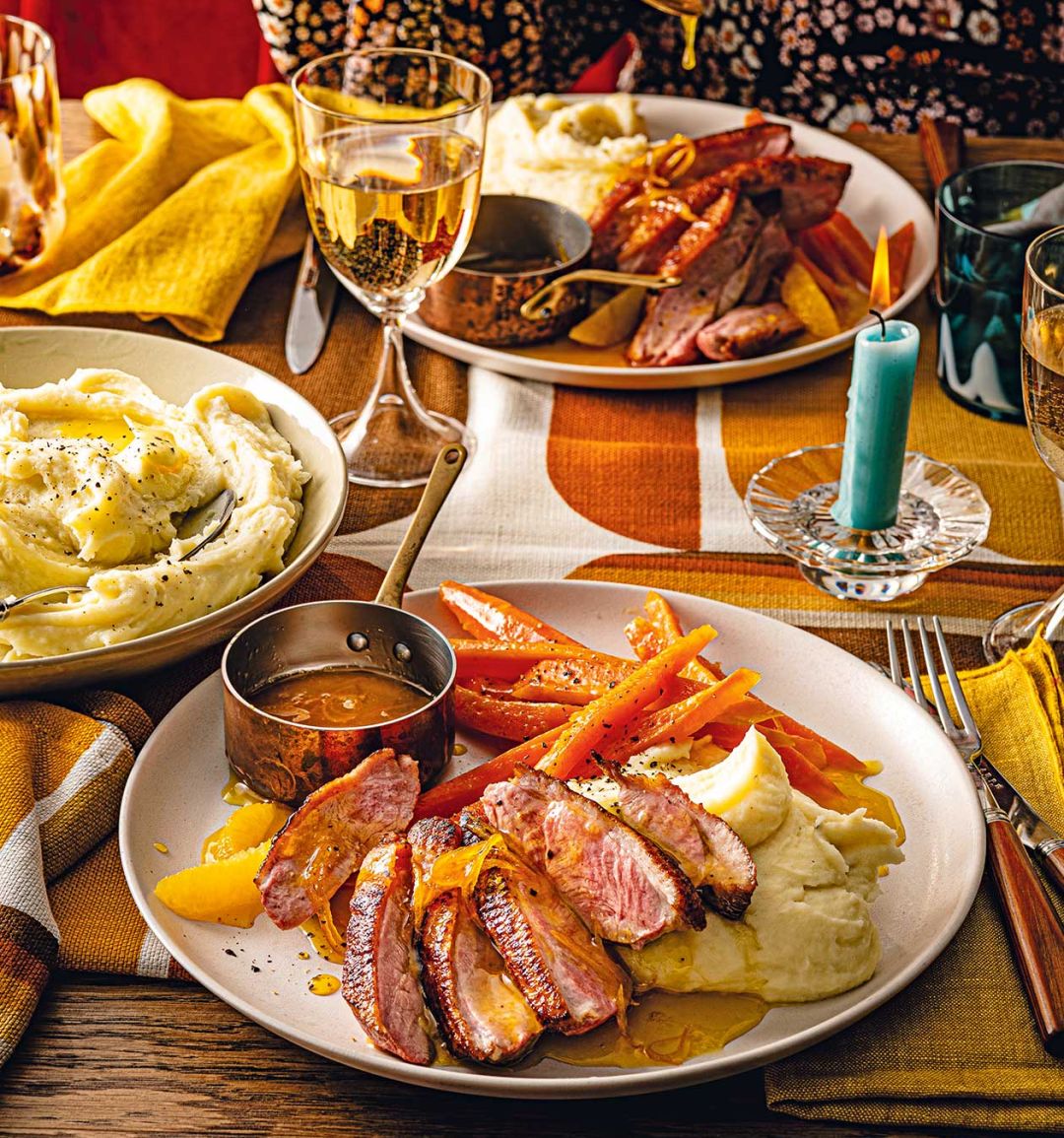 Serve the duck breasts drizzled with the warm orange syrup alongside the glazed carrots and a side of mashed potato.