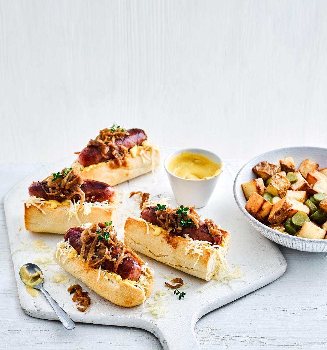 - When the potatoes are cooked, add the sliced cornichons and mix well. Split the hot dog rolls (if using a baguette, warm through in a moderate oven for 5 minutes), add a little cheese and a sausage to each, then spoon over some caramelised onions and more grated cheese. Serve warm, with the crispy potatoes on the side and extra mustard.