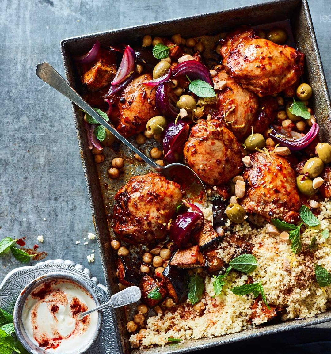 - Swirl the harissa into the yogurt. Scatter the mint leaves and lemon zest over the traybake and serve with the harissa yogurt and some couscous.
