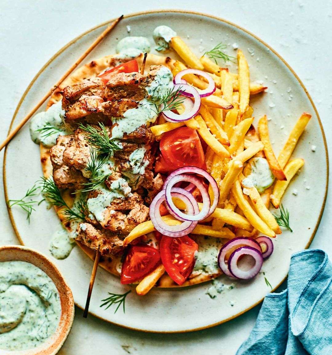 Briefly warm the flatbreads in the oven. Season the onion and tomatoes. Serve the flatbreads with the grilled pork skewers, minted yogurt sauce, fries, onions and tomatoes. Scatter over extra dill fronds to serve.