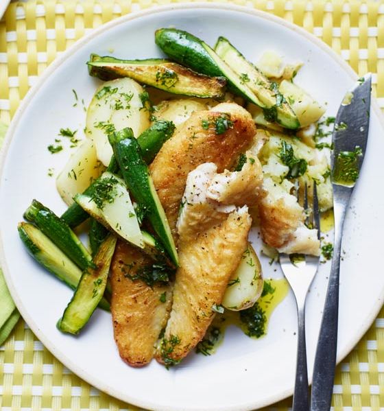- Return the frying pan to the heat with ½ tablespoon oil, pat the fish fillets dry with kitchen paper, then dust with the flour and season. Cook them for 2-3 minutes; flip over, add the butter to the pan and cook for a further 2-3 minutes. Serve with the veg and remaining herby oil.