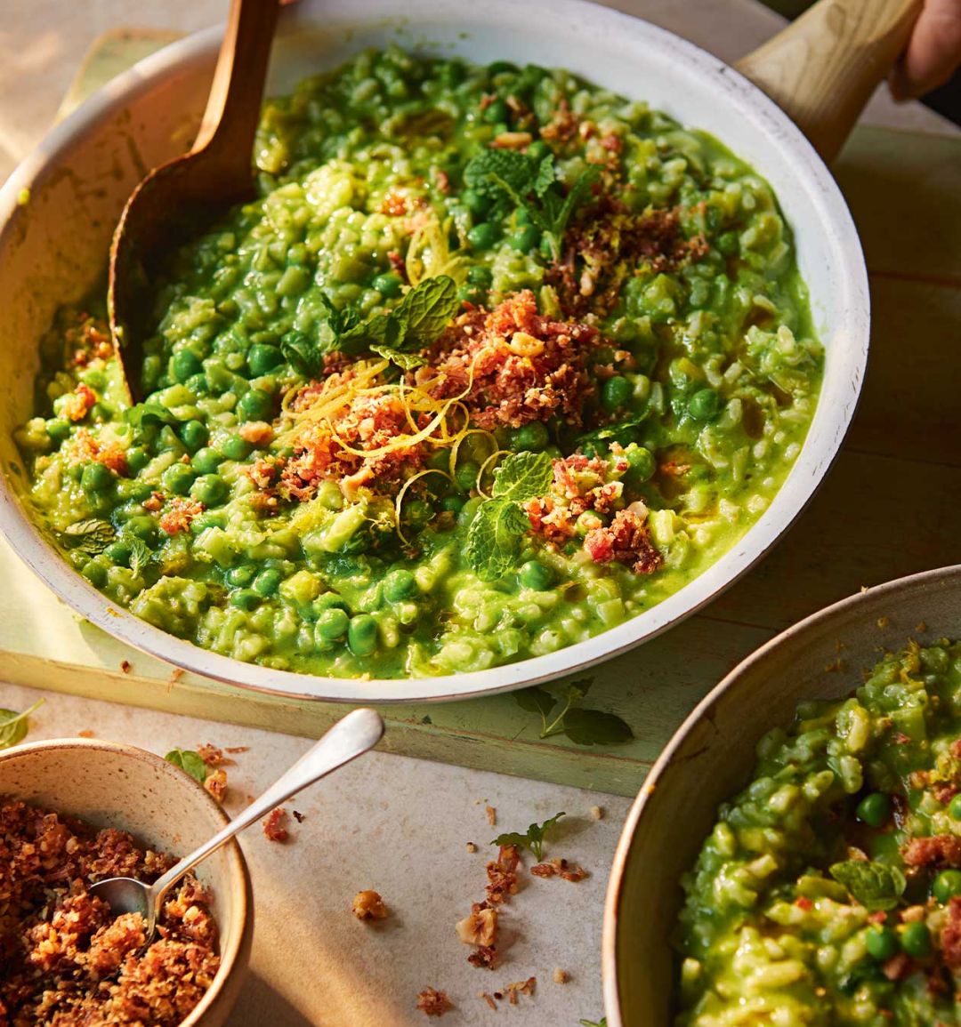Once all the stock has been added, stir in half the pea purée and continue to cook the risotto in the same way, adding the remaining pea purée and reserved whole peas once absorbed. When the rice is cooked through, remove from the heat and stir in the mint. Divide among shallow bowls and scatter over the bacon-hazelnut crumb and lemon zest to serve.
