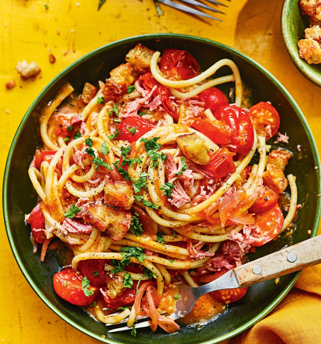 - Drain the pasta, reserving some of the pasta water. Toss the pasta through the sauce, adding a splash of the reserved pasta water. Season well and serve scattered with the cheesy croutons and parsley.