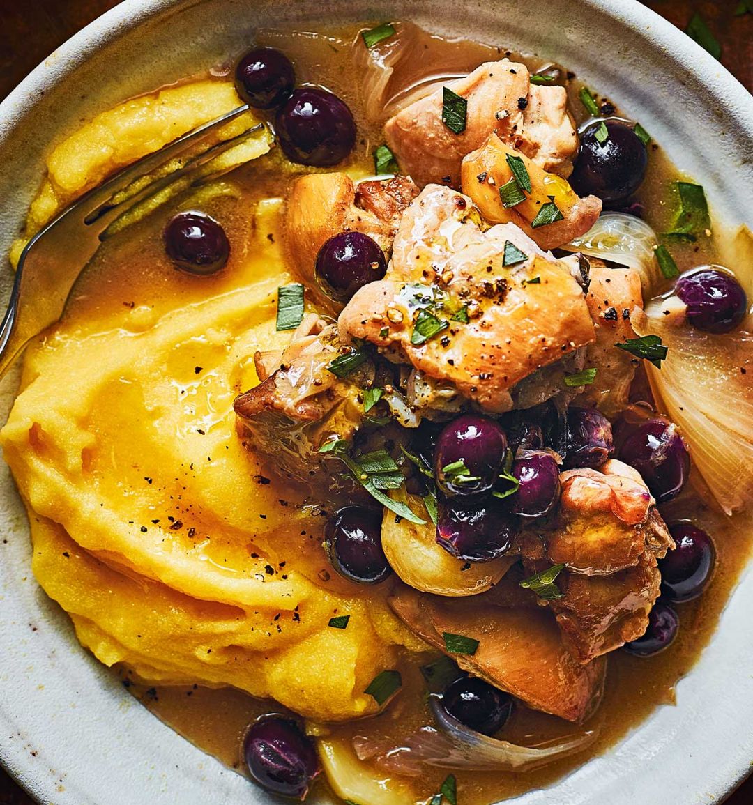 Stir in most of the tarragon and simmer for a few minutes or until the grapes have softened. Add a splash or two of vinegar to taste, top with the remaining tarragon and serve with polenta, if liked.