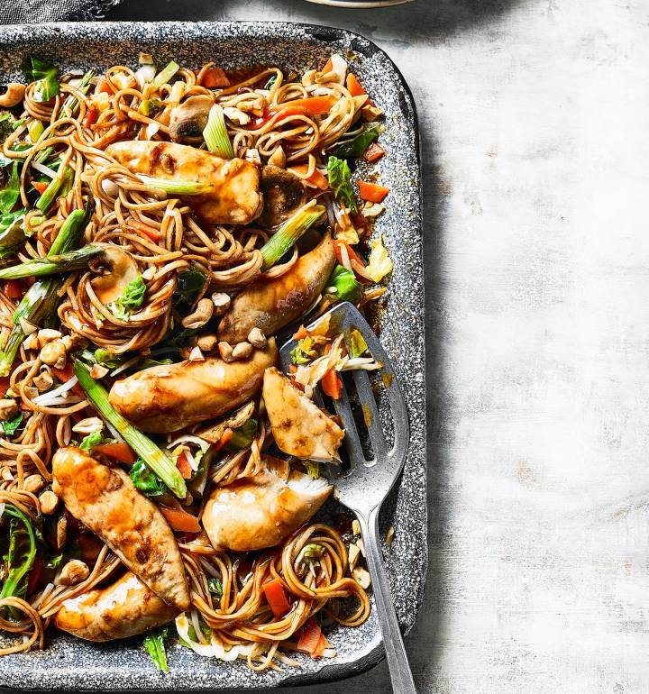 - Add the chow mein sauce, the stir-fry veg and 4 tablespoons of water to the noodles and mix them all together well to coat in the sauce. Tip into the roasting tin, stirring in with the chicken and spring onions. Scatter with the cashew nuts and cook for a further 12 minutes or until the chicken is cooked through and the veg are starting to soften. Divide between 2 plates or bowls.