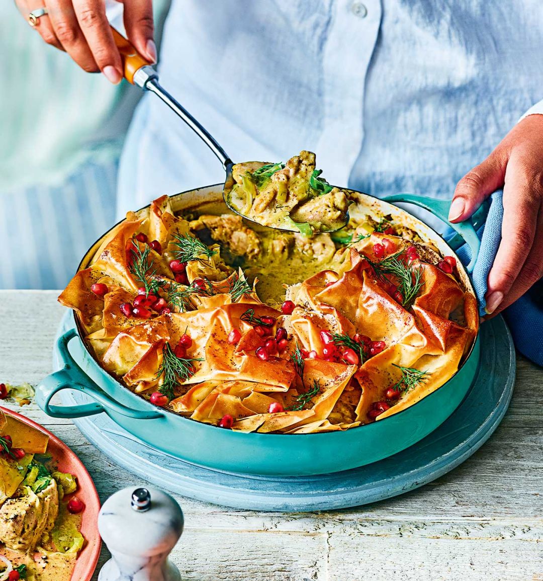 Make the Persian-inspired chicken filling for this fragrant pie up to two days ahead of time. Simply top with scrunched up filo to bake