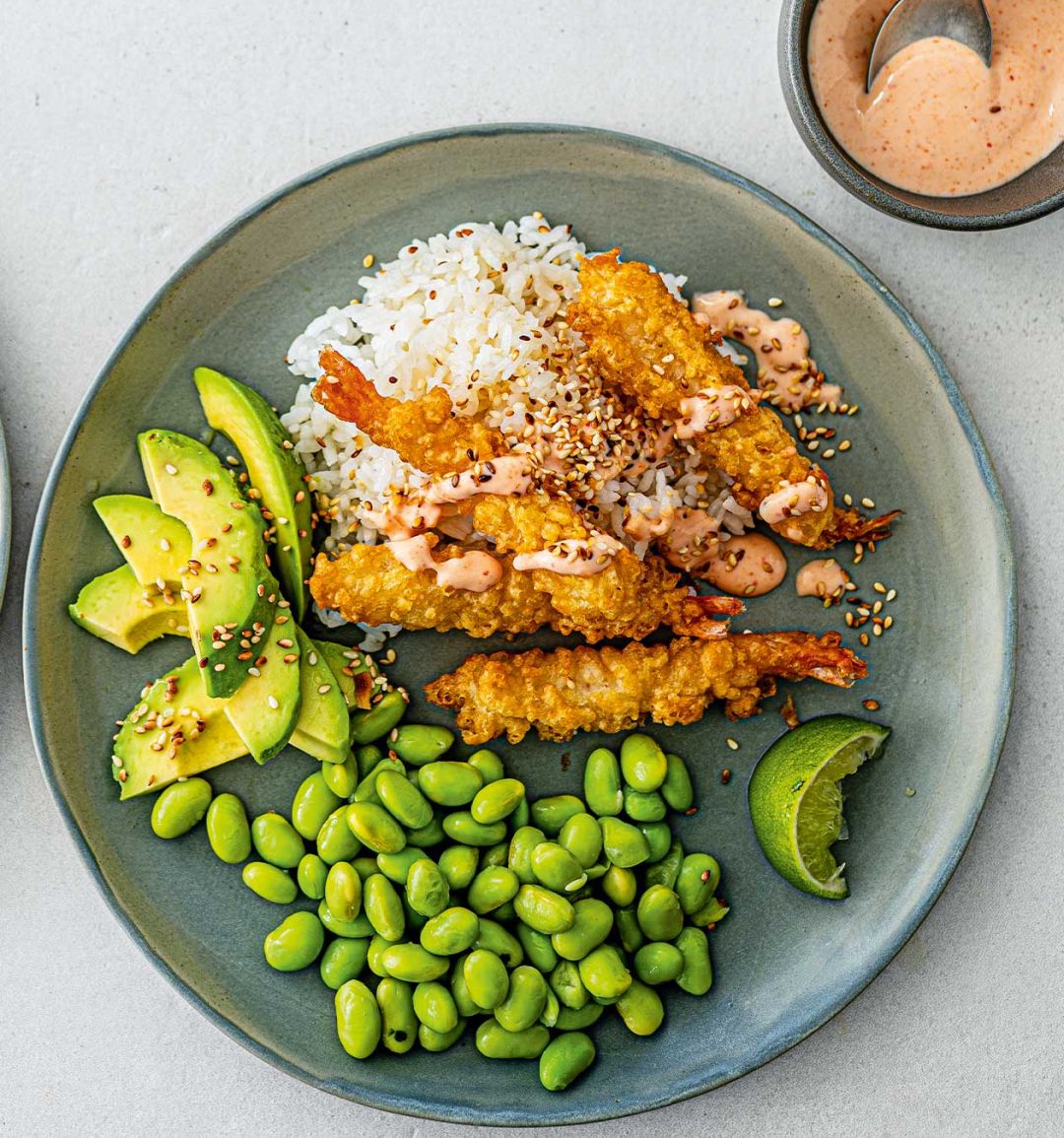 Crispy, golden tempura prawns meet the fresh flavours of lime, avocado and edamame beans in this quick and easy rice dish. A drizzle of sriracha mayo adds a deliciously spicy kick