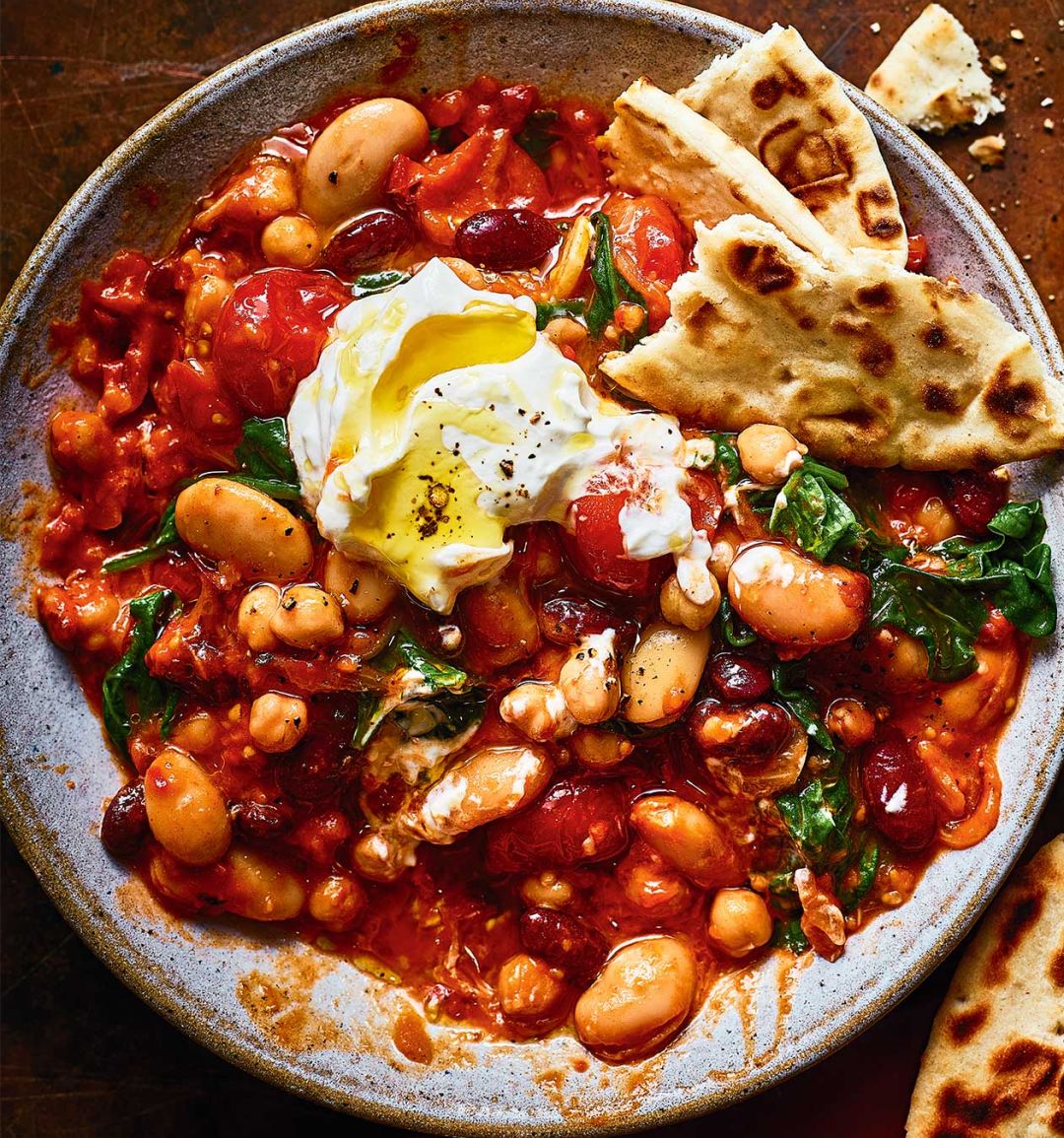 Add the chickpeas along with their liquid, plus the rest of the beans. Bring to the boil then reduce the heat, cover and simmer for 10 minutes. Remove the lid, stir in the ajvar and spinach, and simmer for another 4-5 minutes or until the spinach has wilted. Season to taste.