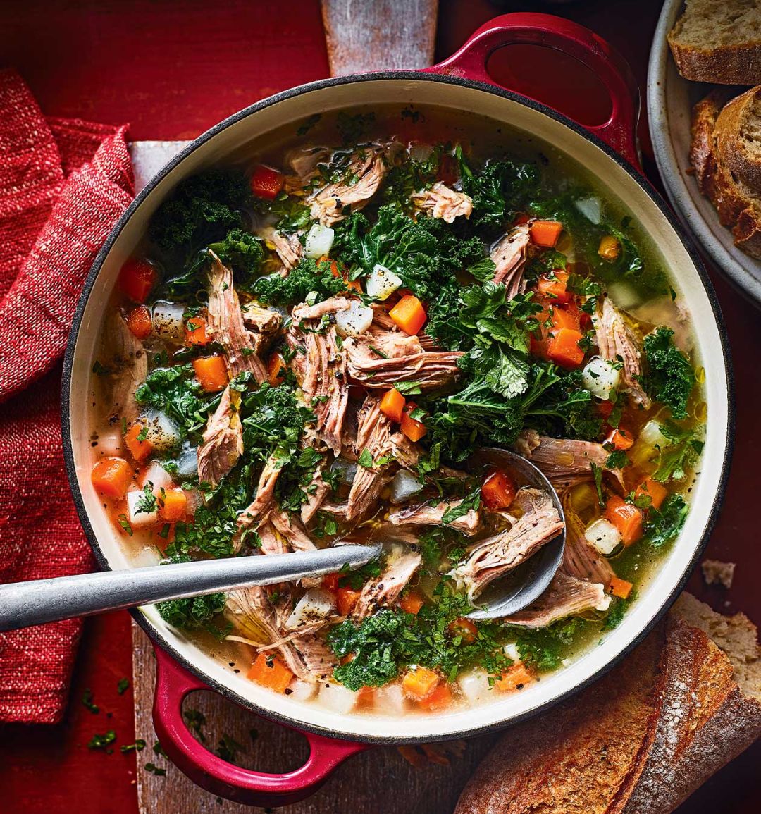 Meanwhile, remove all the meat from the bone and chop/shred. Remove and discard the onion from the casserole and add the meat back in with the kale and simmer for 5 minutes or until the kale has wilted and the lamb has warmed through. Roughly chop the parsley leaves and stir into the stew. Season, divide among bowls and serve with crusty bread.