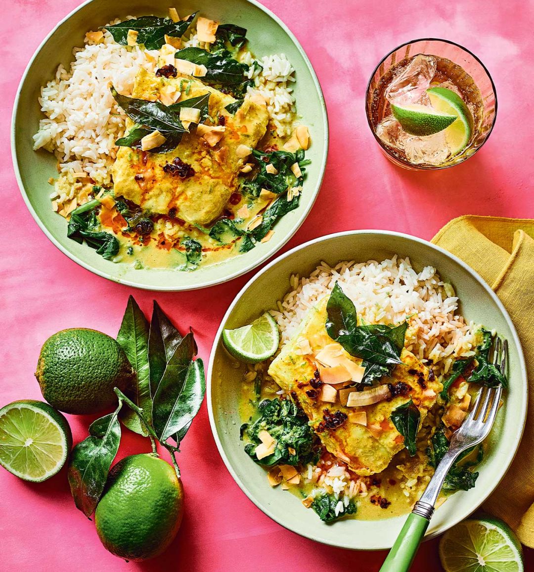 Divide the rice among serving bowls, then use a slotted turner to carefully lift the cod on top. Pour the remaining sauce from the pan into the oven dish and stir to combine. Generously spoon the curry sauce over the fish. Drizzle with a little chilli oil and scatter with the coconut chips and crispy curry leaves, if using. Serve with extra lime wedges.