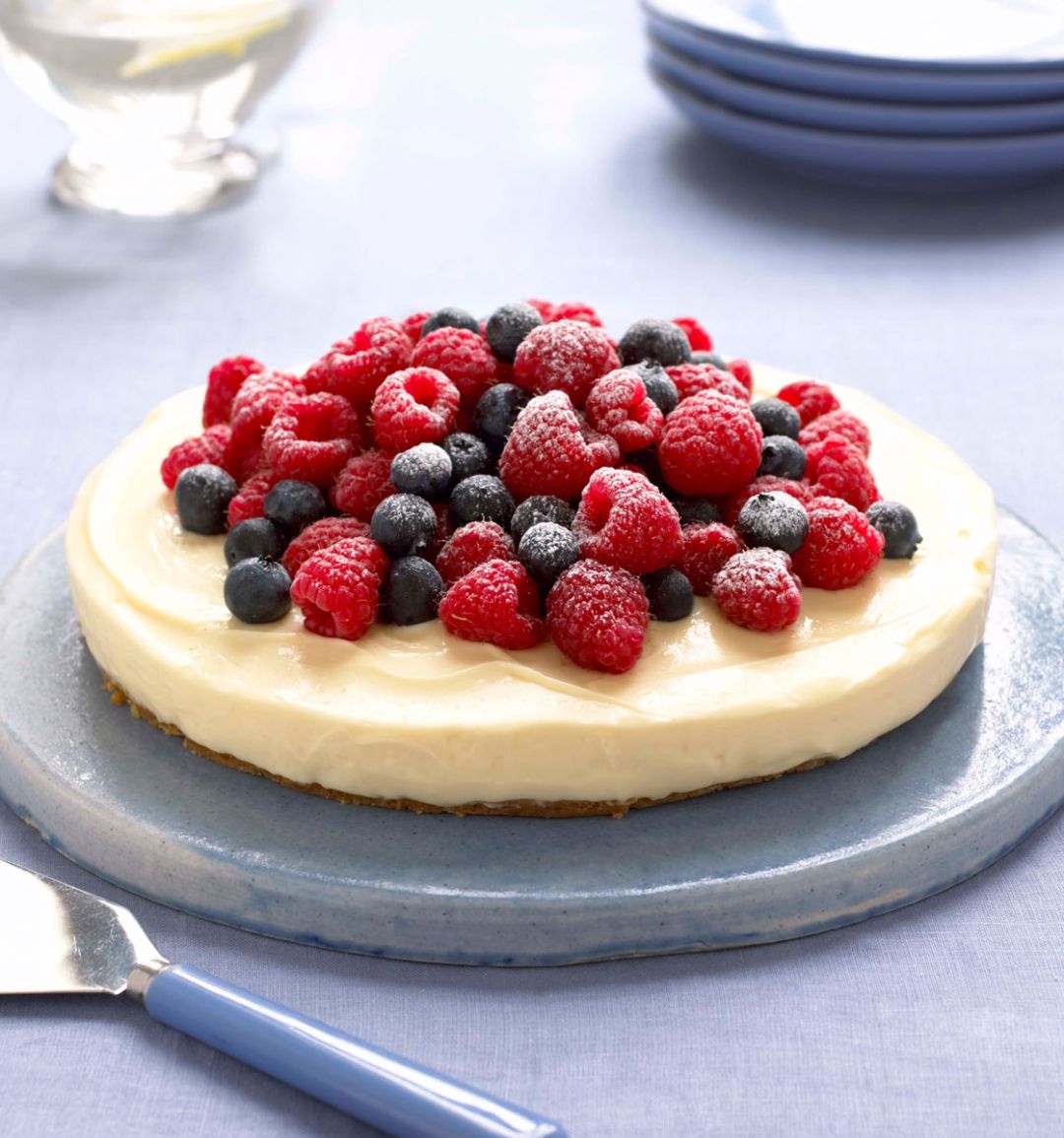 - To serve, remove the cheesecake from the tin, peel off the baking parchment, and arrange on a platter. Decorate with the fruit and dust with icing sugar.