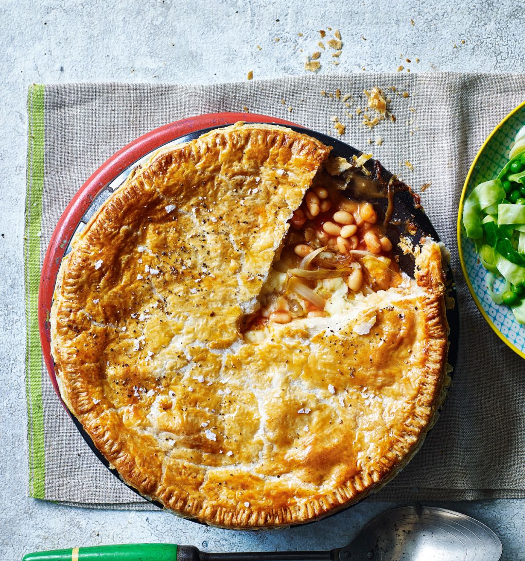 Mix the cheese with the softened onions and season. Scatter over the top of the beans in the dish. Brush some of the egg onto the rim of the dish, then unroll the puff pastry over the top. Trim off the excess pastry.