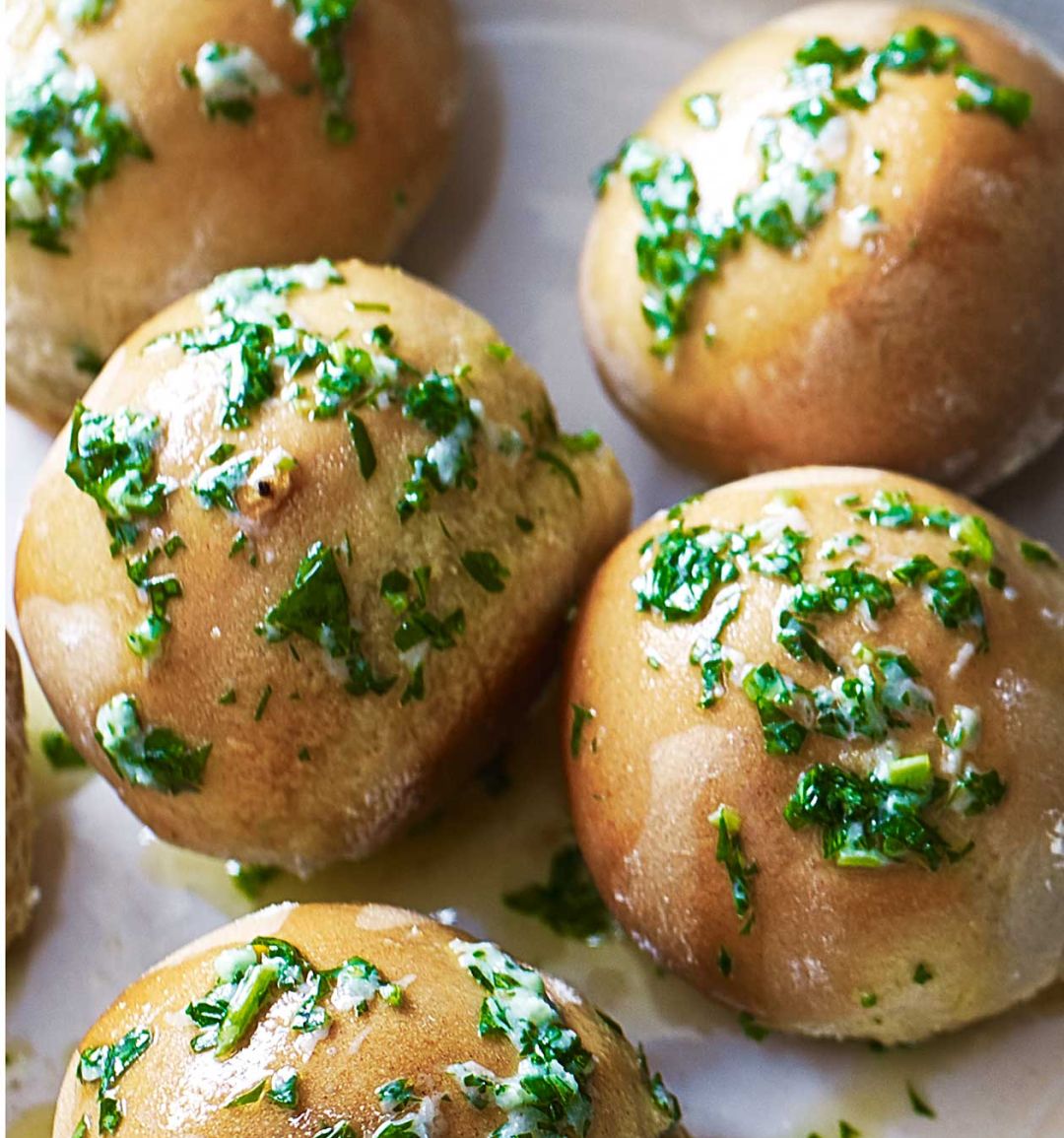 - Cool for 10-15 minutes before serving. Mix the soft butter and olive oil together, and mash in the garlic and parsley. Serve the warm dough balls with the garlic mixture brushed over them.